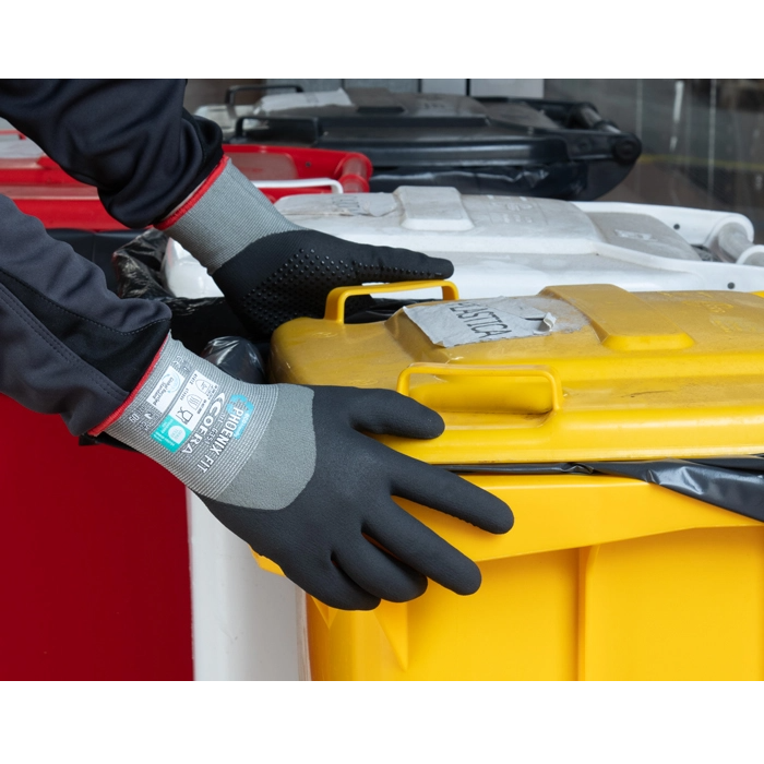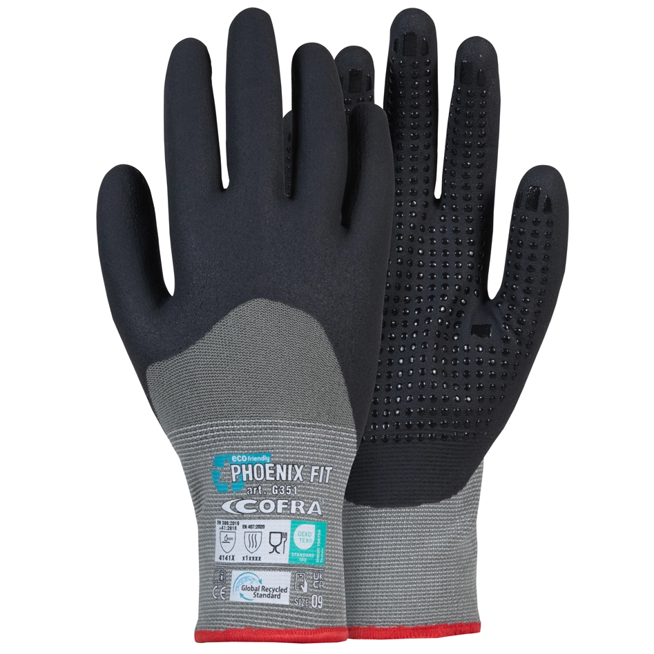 Γάντια Νιτριλίου με κουκίδες Cofra Phoenix Fit. Διαθέτουν κουκίδες νιτριλίου στην παλάμη για καλύτερο κράτημα αντικειμένων. Προτεινόμενη εφαρμογή: αυτοκινητοβιομηχανία, logistics, αποθήκη, χόμπι, εργασία με ολισθηρά αντικείμενα, κήπος, κατασκευές, δημοτικές υπηρεσίες, συναρμολόγηση και συσκευασία μικρών ανταλλακτικών.