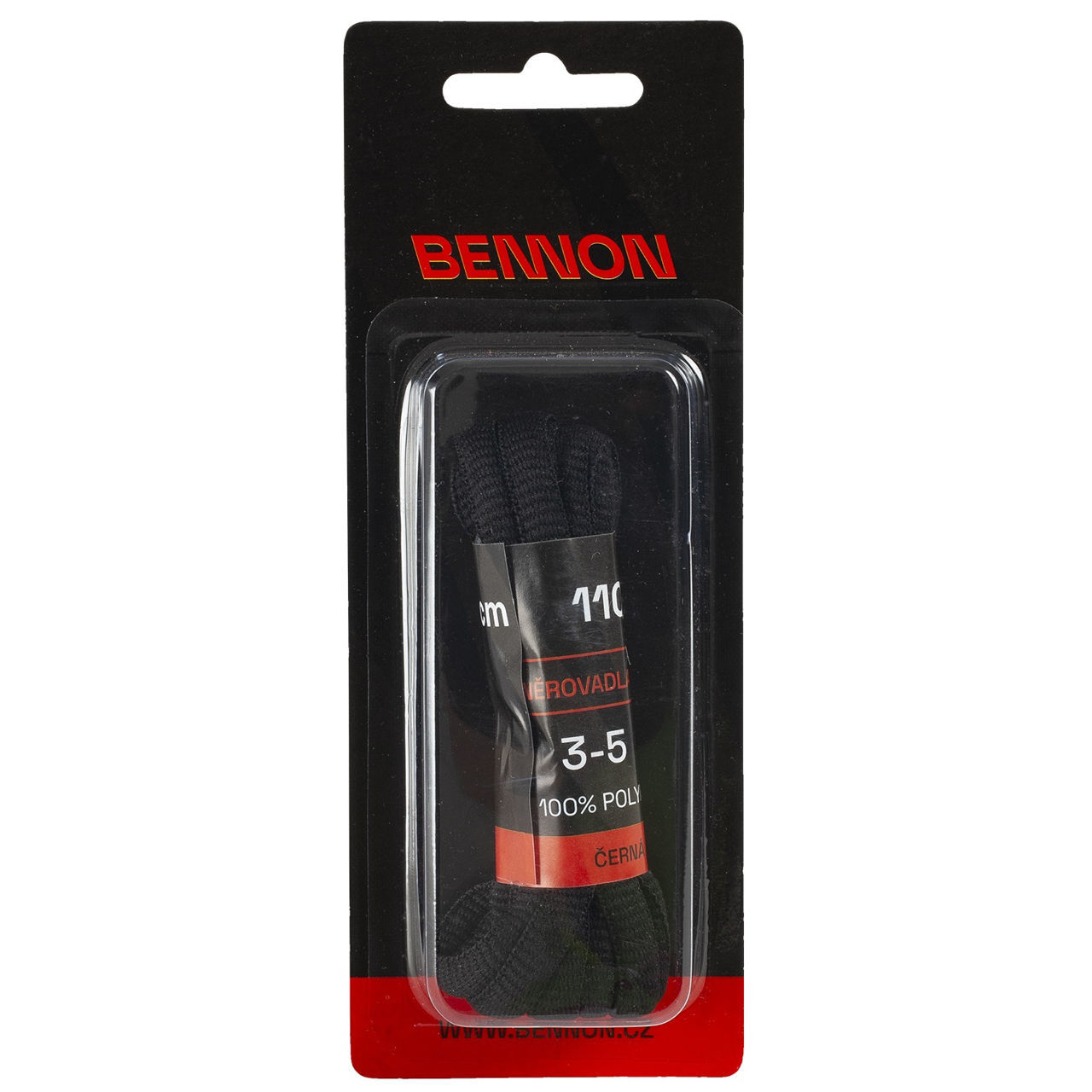 Κορδόνια παπουτσιών της Bennon σε μαύρο χρώμα και μήκους 110εκ. 100% πολυεστερικά, κατάλληλα για χαμηλά παπούτσια, καλύπτουν 3-5 θηλύκια.