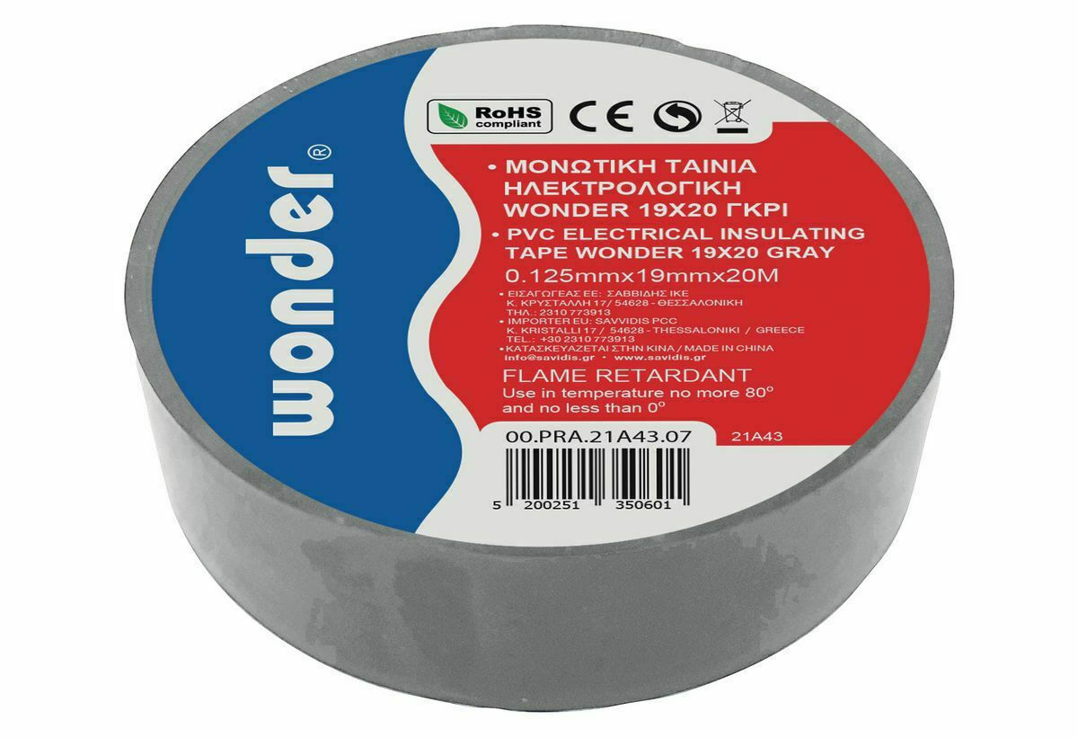 Η μονωτική ταινία γκρι 19mm x 20m από βραδύκαυστο PVC προσφέρει εξαιρετική ελαστικότητα και ποιοτική κόλλα για ασφαλή και αξιόπιστη χρήση. Κατασκευασμένη από ειδικό πολυμερές PVC, αποτελεί αποτελεσματική λύση για μόνωση, προστασία και ενίσχυση μόνωσης αγωγών και καλωδίων. Διατίθεται σε διάφορα χρώματα για τη σήμανση και κωδικοποίηση αγωγών και καλωδίων.