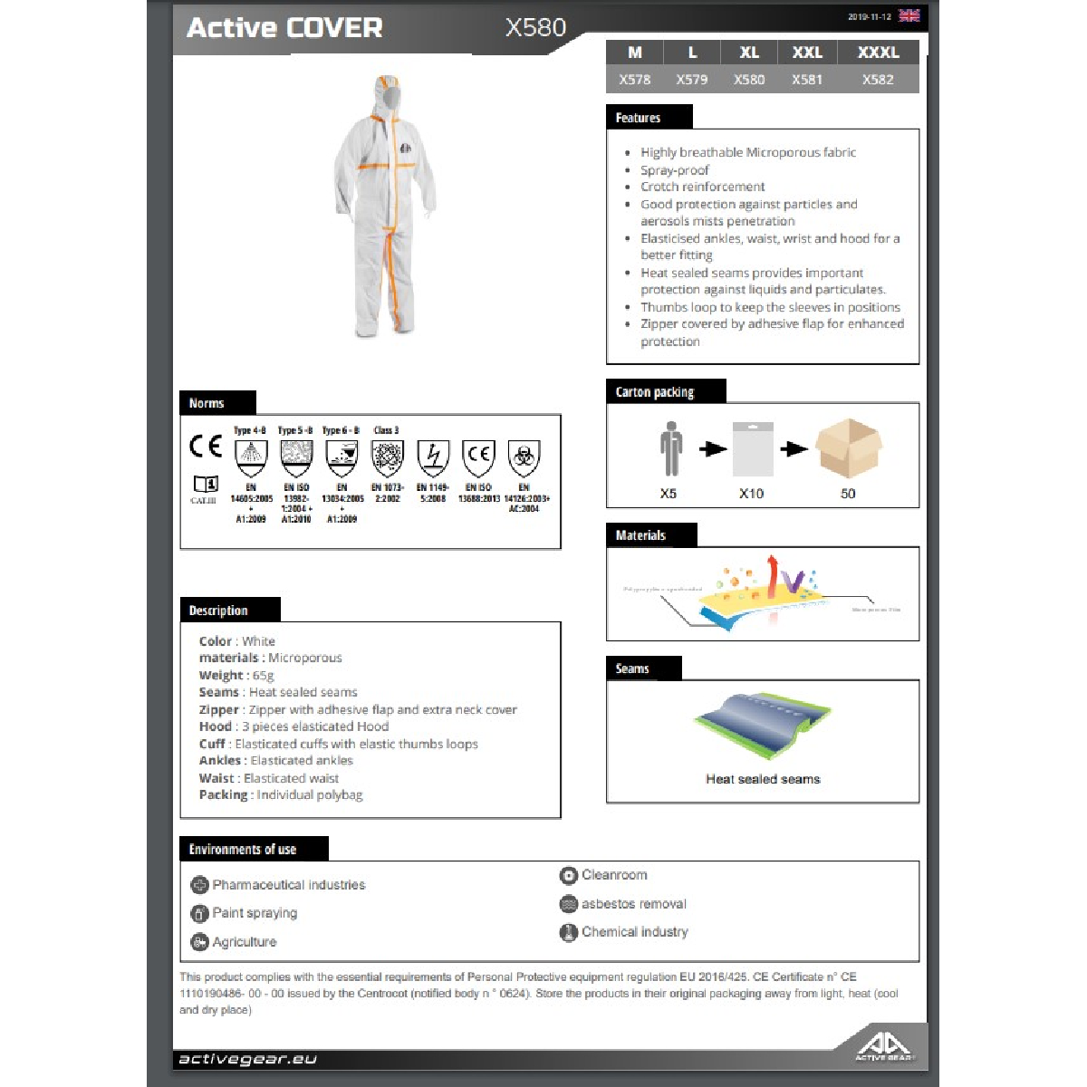 Πρότυπα: EN 1073-2:2002 Κλάση 2, EN 14126:2003+AC:2004, EN 1149-5:2018, EN ISO 13688:2013, EN ISO 13982-1:2004 + A1:2010 (Τύπος 5-B), EN 13034:2005 + A1:2009 (Τύπος 6-B), EN 14605:2005+A1:2009 (Τύπος 4-B)
