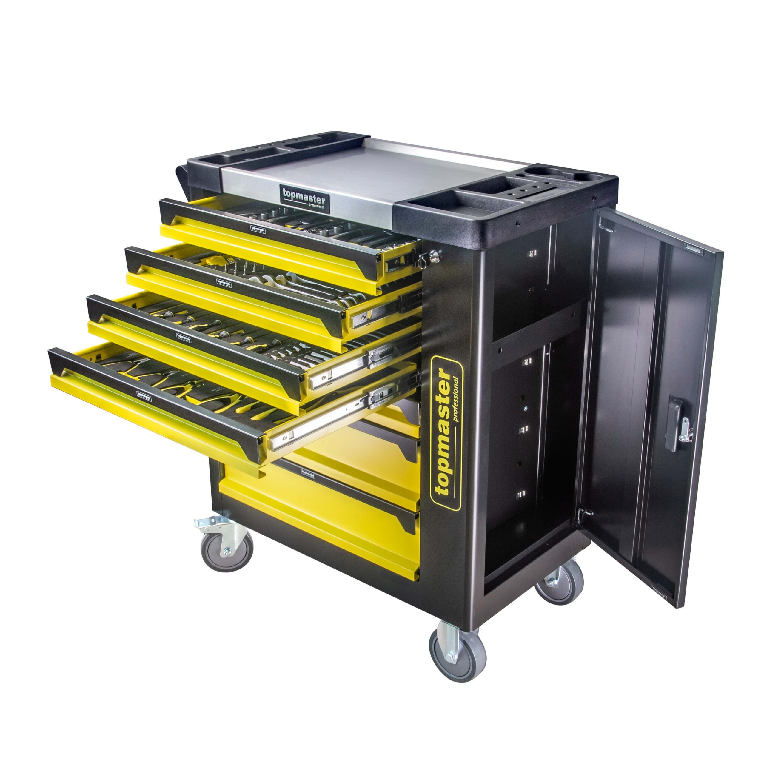 Ο τροχήλατος εργαλειοφόρος TOP MASTER με 7 συρτάρια είναι ιδανικός για επαγγελματίες. Διαθέτει στιβαρή μεταλλική κατασκευή, 550kg αντοχή και 182 εξαρτήματα. Έχει κεντρικό κλείδωμα, μηχανισμό αποτροπής τυχαίου ανοίγματος, εργονομική λαβή και ροδάκια PVC/PP. Η ανοξείδωτη επιφάνεια με 5 θήκες και η πλαϊνή πόρτα προσφέρουν επιπλέον αποθήκευση.